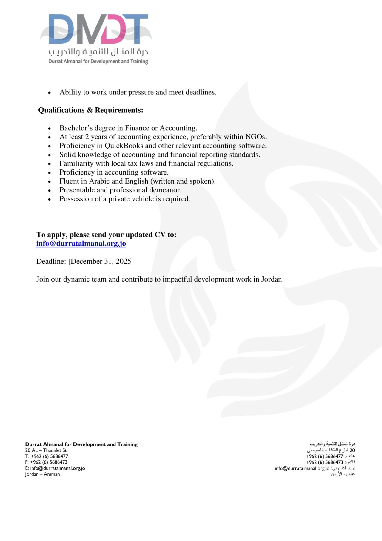 تعلن درة المنال للتنمية والتدريب (DMDT) عن حاجتها إلى محاسب Junior بدوام كامل للانضمام إلى فريقها المالي في عمّان.