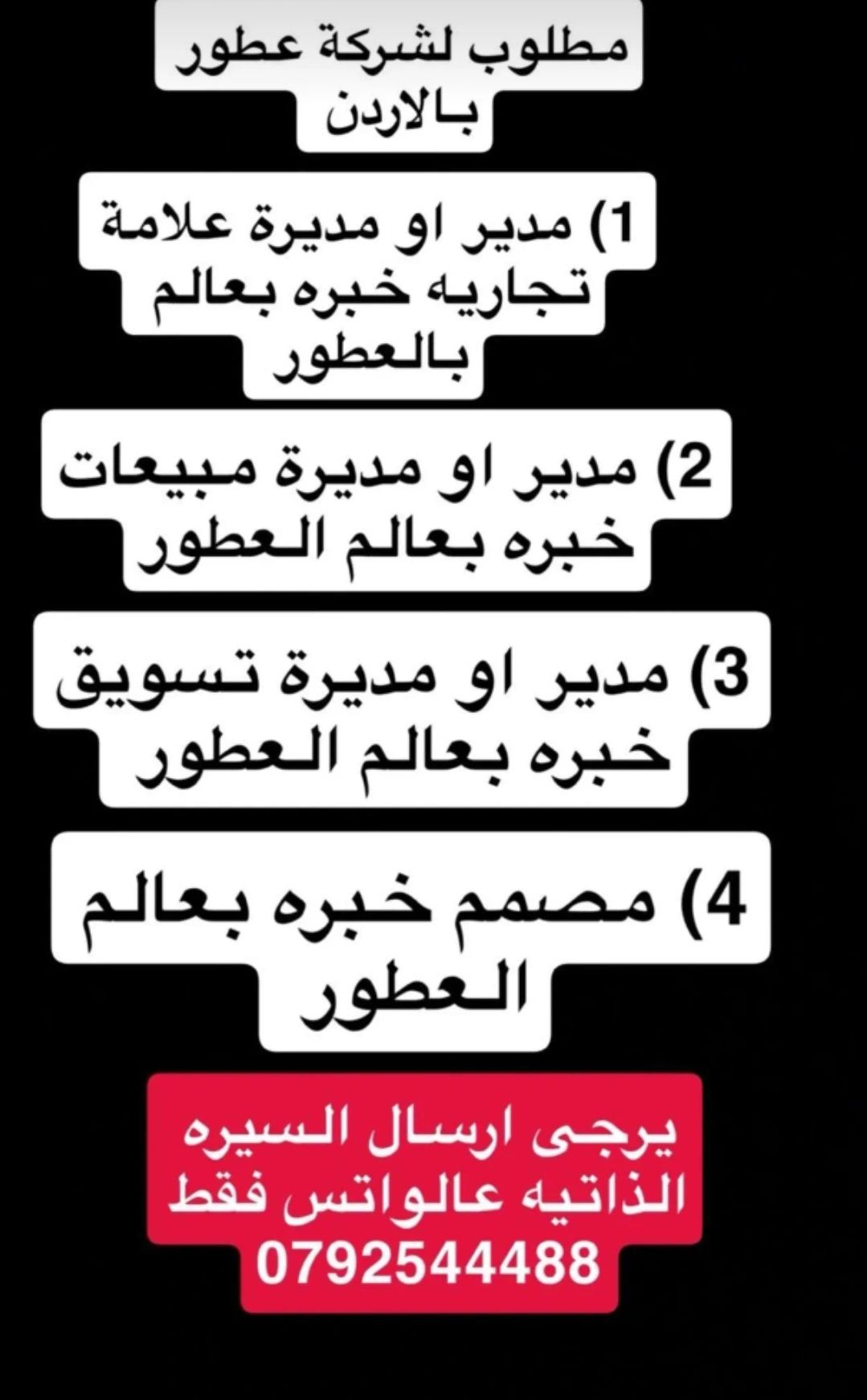 يرجى إرسال السيرة الذاتية عبر واتساب فقط على الرقم: