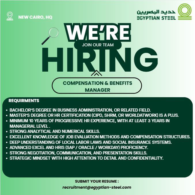 Compensation & Benefits Manager للانضمام إلى فريق الموارد البشرية في المقر الرئيسي – القاهرة الجديدة.