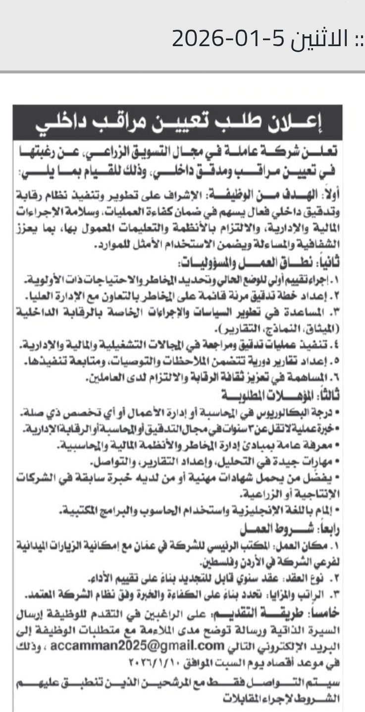 تُعد وظيفة مراقب داخلي من أهم وظائف التدقيق في الأردن، خاصة في الشركات العاملة في القطاع الزراعي، لما لها من دور أساسي في تعزيز الرقابة وتحسين الأداء المالي والإداري.