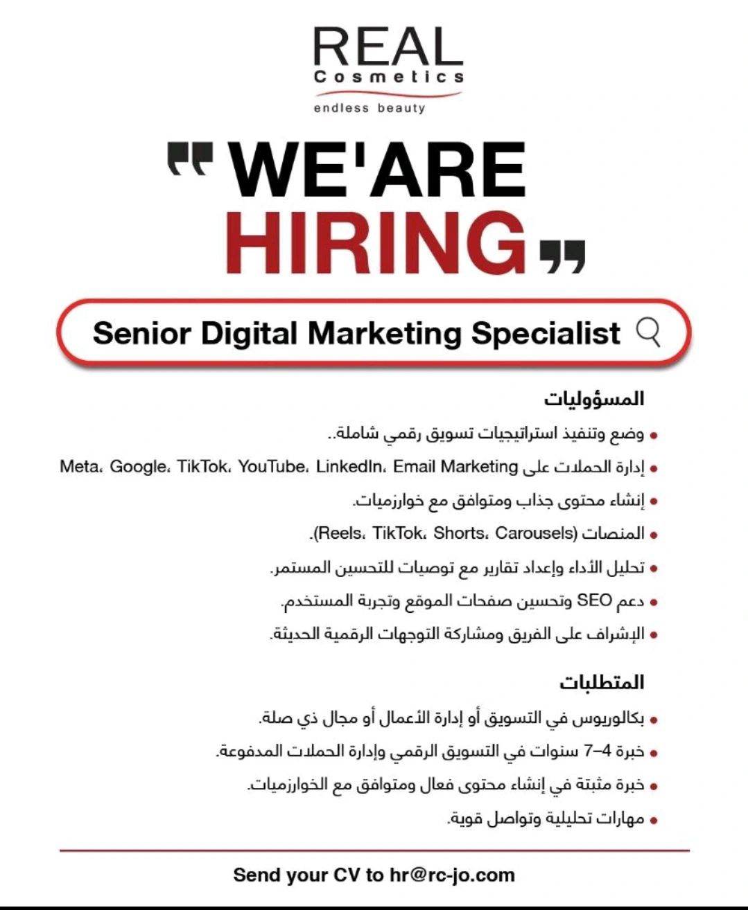 تُعد وظيفة Senior Digital Marketing Specialist من أكثر وظائف التسويق الرقمي طلبًا في الأردن، خاصة في شركات مستحضرات التجميل التي تعتمد على الأداء الرقمي والتحليل وصناعة المحتوى.