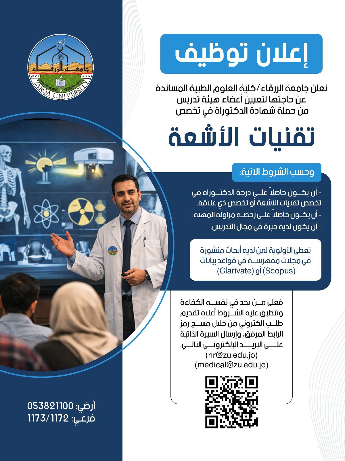 تعلن جامعة الزرقاء عن فتح باب التقديم لتعيين عضو هيئة تدريس من حملة شهادة الدكتوراه في تقنيات الأشعة، للعمل ضمن كلية العلوم الطبية المساندة، في بيئة أكاديمية داعمة للبحث العلمي والتطوير المهني.