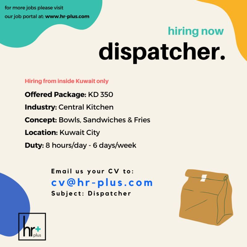 شركة HR Plus تبحث عن Dispatcher للعمل في Central Kitchen في مدينة الكويت. إذا كنت تبحث عن فرصة عمل جديدة مع راتب جيد، هذه الوظيفة لك!