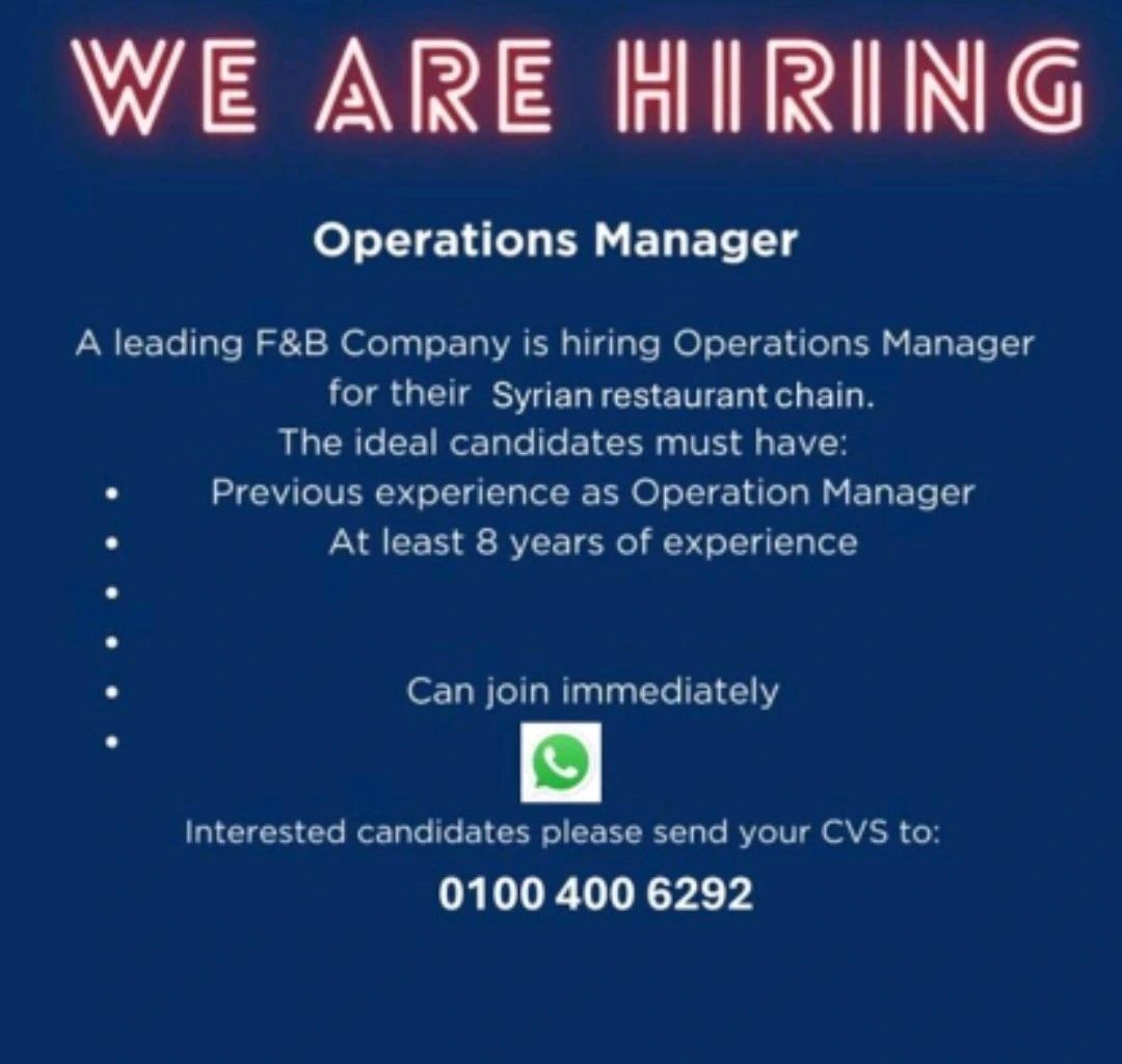 شركة مطاعم رائدة تعلن عن حاجتها للتعاقد الفوري مع Operations Manager لإدارة وتشغيل سلسلة مطاعم متخصصة، مع فرصة حقيقية للاستقرار والتطور المهني.