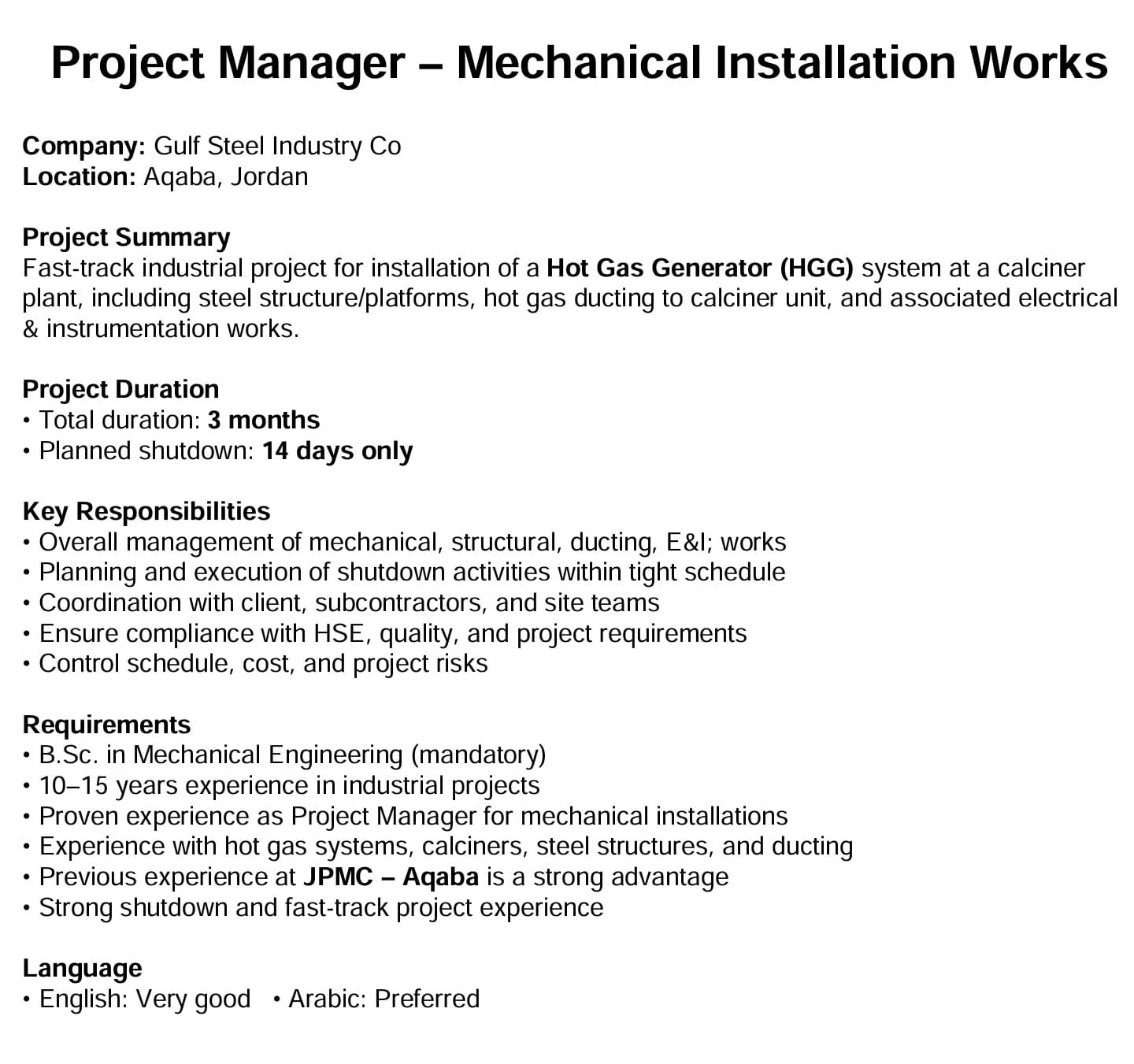 تعلن شركة خليج العقبة لصناعة الحديد (Gulf Steel Industry Co) عن حاجتها لتعيين مدير مشروع للعمل ضمن مشروع صناعي عاجل (Fast-track) في محافظة العقبة.