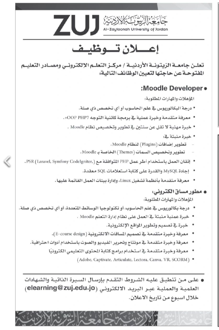 تعلن جامعة الزيتونة الأردنية عن حاجتها لتوظيف مطور Moodle ومطور مسار إلكتروني للعمل في مركز التعليم الإلكتروني. إذا كنت تمتلك المهارات المطلوبة، قدم الآن!