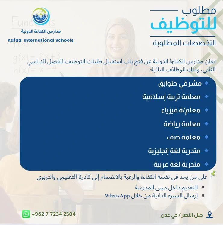 إذا كنت تبحث عن وظائف تعليمية في الأردن أو فرص توظيف معلمين ومعلمات في مدارس دولية، فإن مدارس الكفاءة الدولية توفر فرص عمل مميزة في مختلف التخصصات التعليمية والتربوية، مع إمكانية التقديم الفوري وسهولة التواصل.