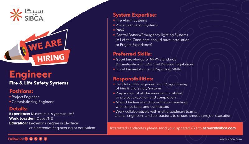 شركة SIBCA تعلن عن شواغر هندسية فورية للانضمام إلى فريقها المتخصص في Fire & Life Safety Systems.