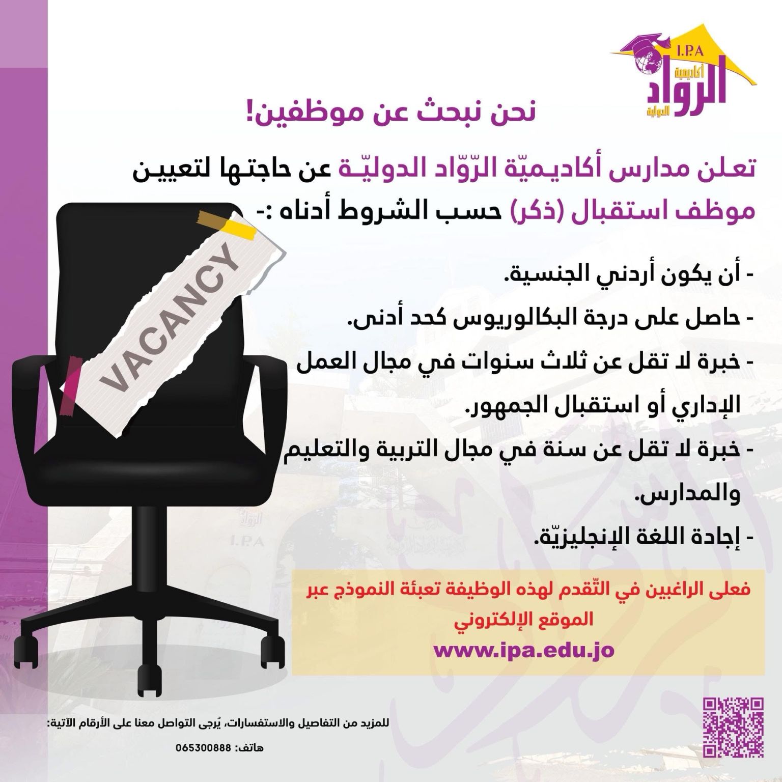 تعلن مدارس أكاديمية الرواد الدولية (IPA) عن حاجتها لتعيين موظف استقبال (ذكر) للعمل ضمن بيئة تعليمية احترافية، منظمة، ومحفزة، وفق الشروط التالية: