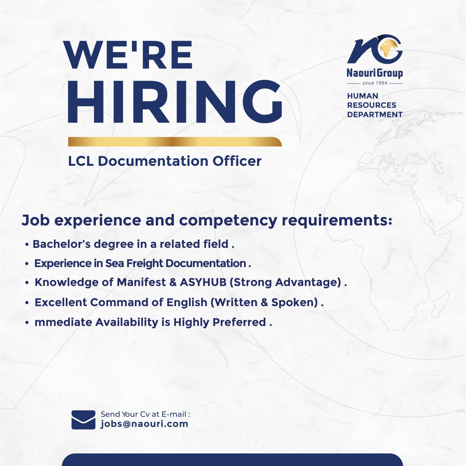 تعلن Naouri Group عن فتح باب التوظيف لوظيفة LCL Documentation Officer ضمن فريق الشحن البحري، وذلك للأشخاص المؤهلين وجاهزين لبدء العمل فورًا.