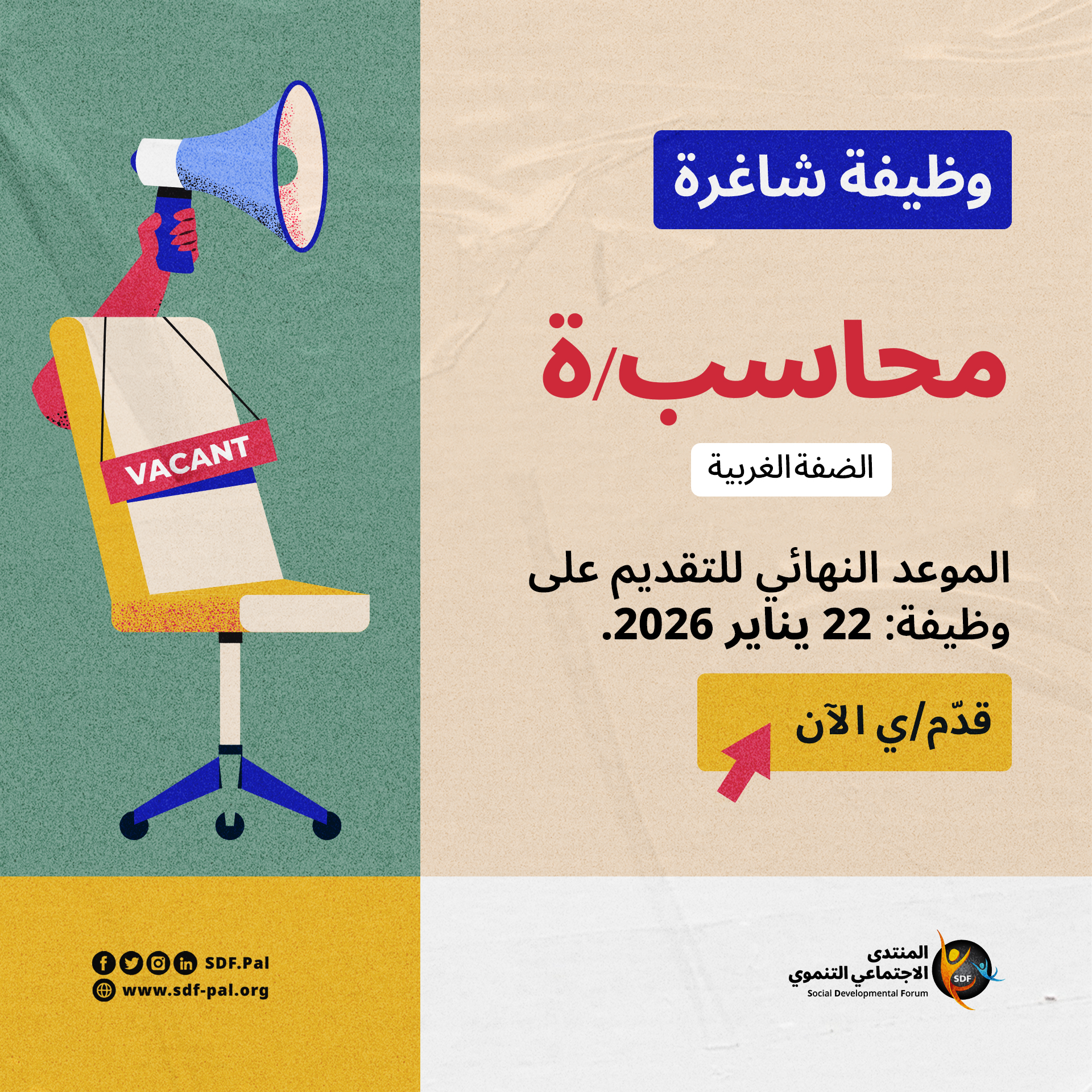 يعلن المنتدى الاجتماعي التنموي، مؤسسة أهلية غير حكومية رائدة في التنمية المستدامة، عن حاجته لتوظيف محاسب/ة مشروع لدعم العمليات المالية لمشاريع المؤسسة في الضفة الغربية.