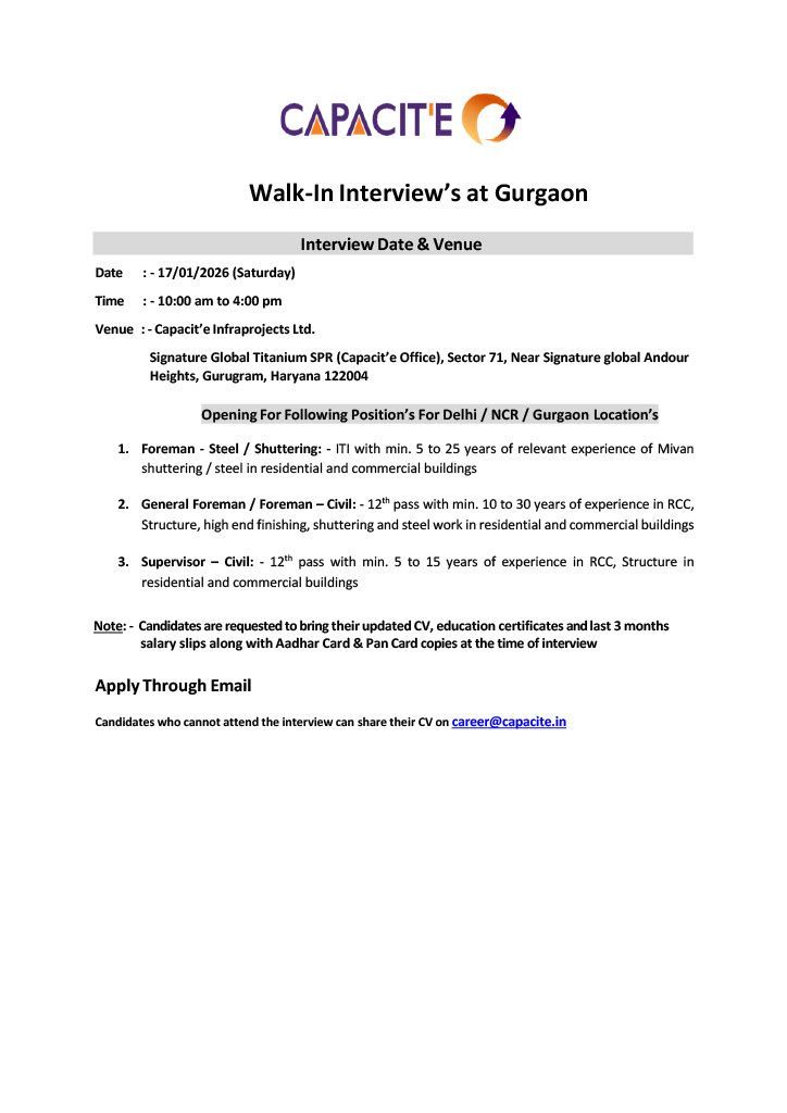 تُعلن شركة Capacit’e Infraprojects Ltd. عن مقابلات عمل فورية (Walk-In Interview) في Gurgaon لتعيين كوادر مدنية وفنية بخبرة قوية في المشاريع السكنية والتجارية.