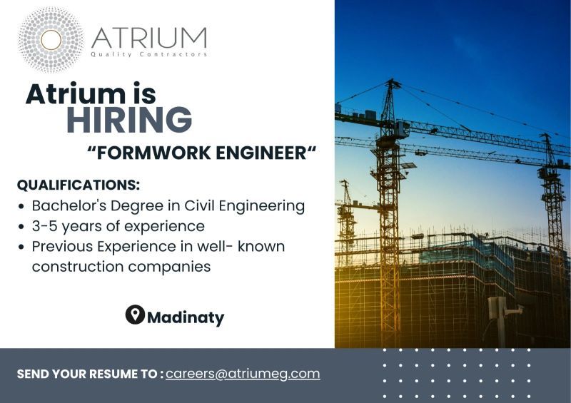 تُعلن شركة Atrium Quality Contractors عن حاجتها إلى مهندس Formwork للانضمام إلى فريق العمل في أحد مشروعاتها الكبرى بمدينة المستقبل (Madinaty / Mostakbal City)، ضمن بيئة احترافية وفرص نمو حقيقية.