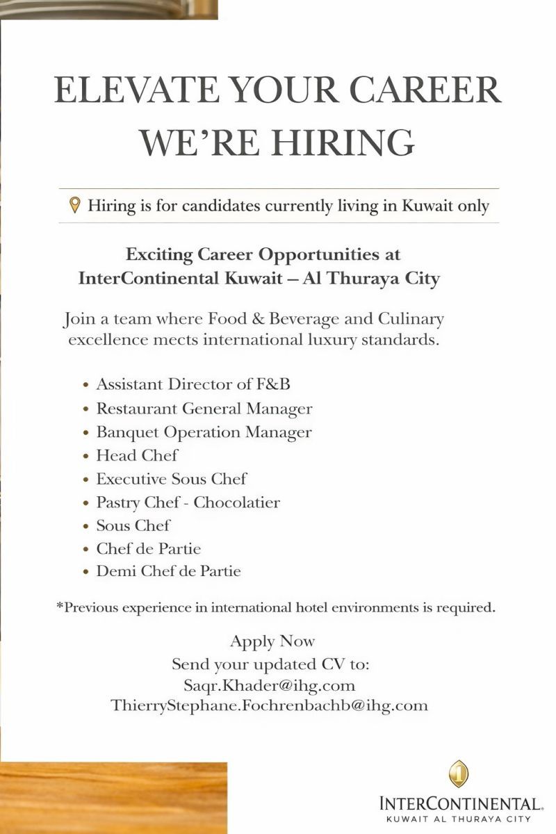 يعلن InterContinental Kuwait – Al Thuraya City عن فرص توظيف مميزة ضمن قطاع الأغذية والمشروبات وفنون الطهي.