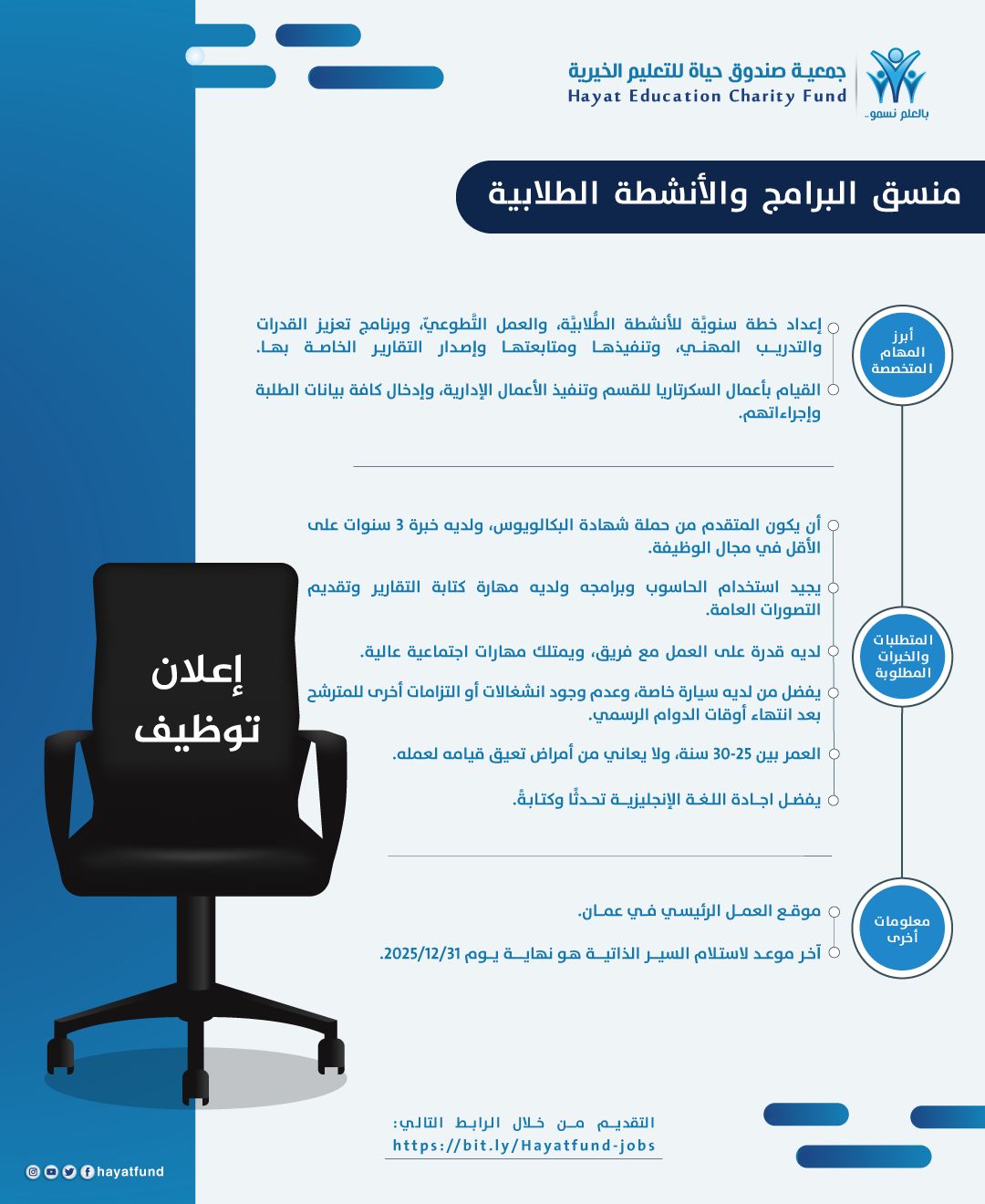 يعلن صندوق حياة للتعليم الخيرية عن حاجته إلى منسق برامج وأنشطة طلابية يتمتع بالشغف، والتنظيم، والقدرة على التأثير الإيجابي، ليكون جزءًا من فريق يعمل على تمكين الطلبة وبناء مستقبلهم التعليمي والمهني.