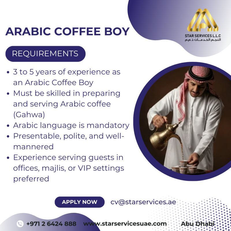تعلن Star Services L.L.C عن حاجتها إلى Arabic Coffee Boy (قهوجي قهوة عربية) للعمل في مكاتب رسمية، مجالس، ومواقع كبار الشخصيات (VIP) داخل إمارة أبوظبي.