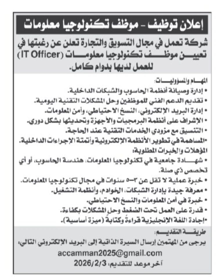 وظيفة IT Officer بدوام كامل | فرصة مميزة في شركة تسويق وتجـارة