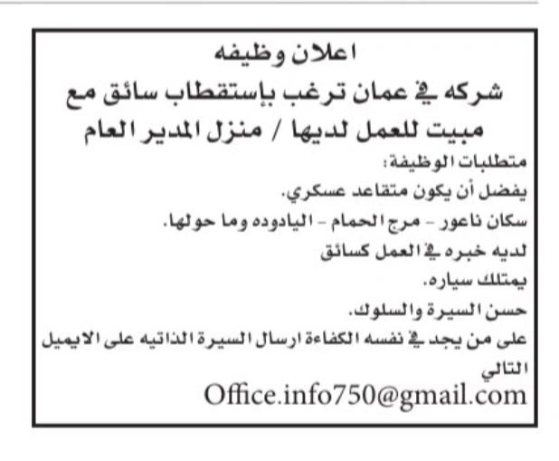 تعلن شركة خاصة في عمّان عن رغبتها في استقطاب سائق خاص مع مبيت للعمل في منزل المدير العام، ضمن بيئة عمل مستقرة وبشروط واضحة، مع أولوية للمتقاعدين العسكريين وأصحاب الخبرة.