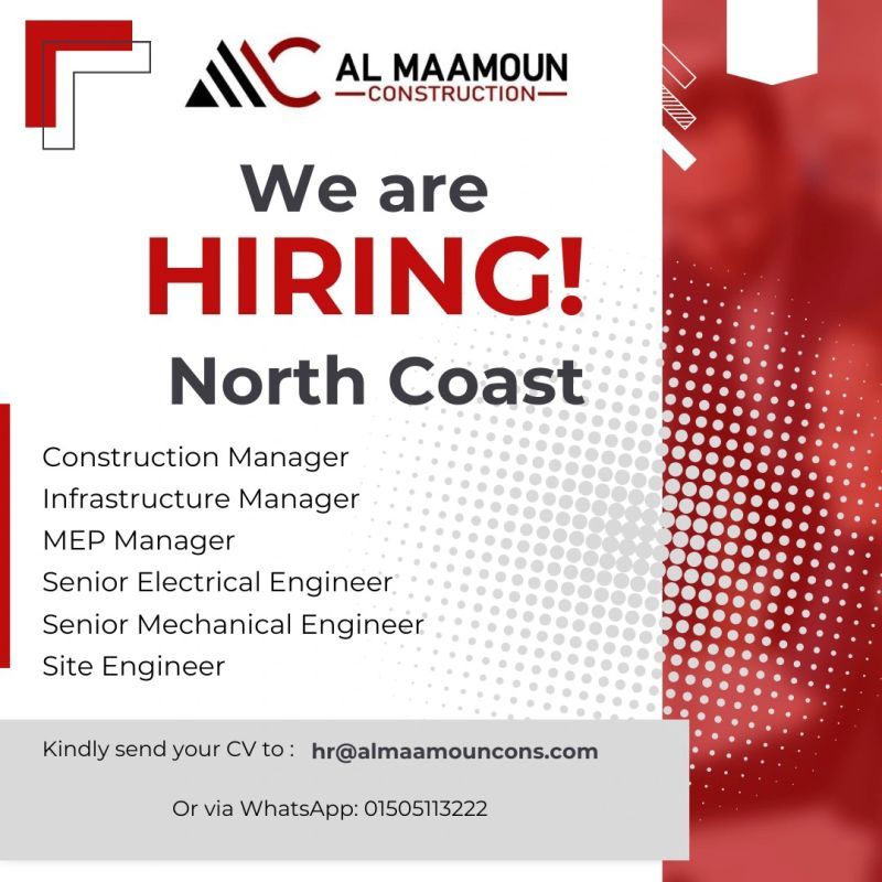 تعلن شركة المأمون للإنشاءات – Al Maamoun Construction عن فتح باب التوظيف فورًا لعدد من الوظائف الهندسية والإدارية للعمل بمشروعاتها القومية في الساحل الشمالي.