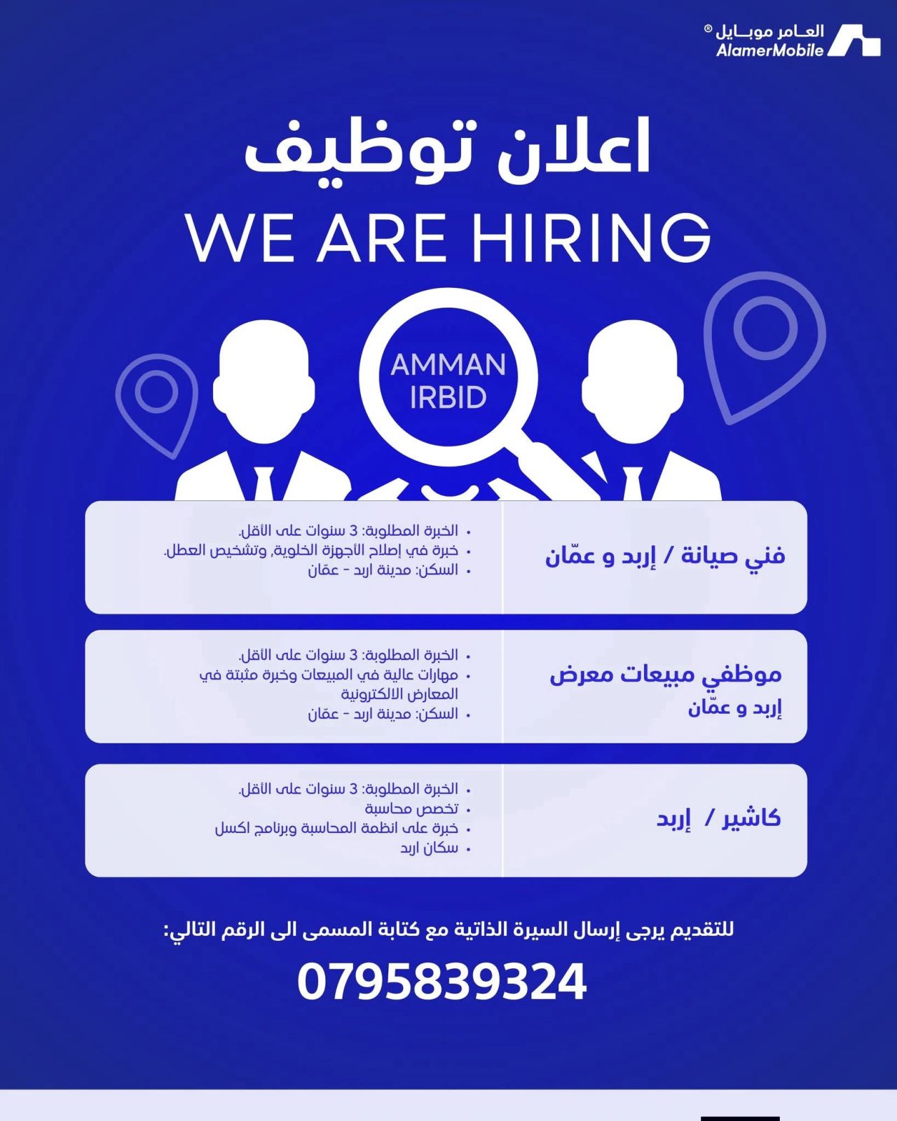 تُعلن شركة العامر موبايل – Alamer Mobile عن توفر وظائف شاغرة فورية في عمّان وإربد ضمن فريقها المتوسع.