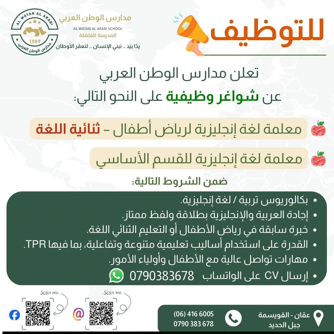📢 إعلان توظيف – فرص عمل تعليمية في عمّان