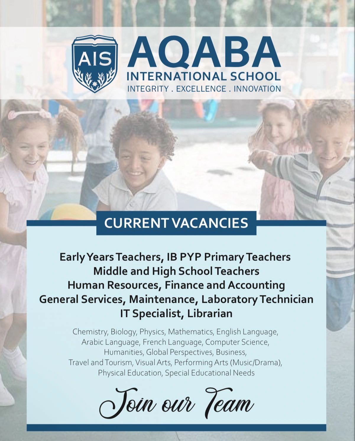 تعلن مدرسة العقبة الدولية (Aqaba International School) عن فتح باب التوظيف للعام الدراسي 2026/2027 لاستقطاب معلمين ومعلمات وكوادر إدارية مؤهلة للانضمام إلى فريقها التعليمي المتميز.