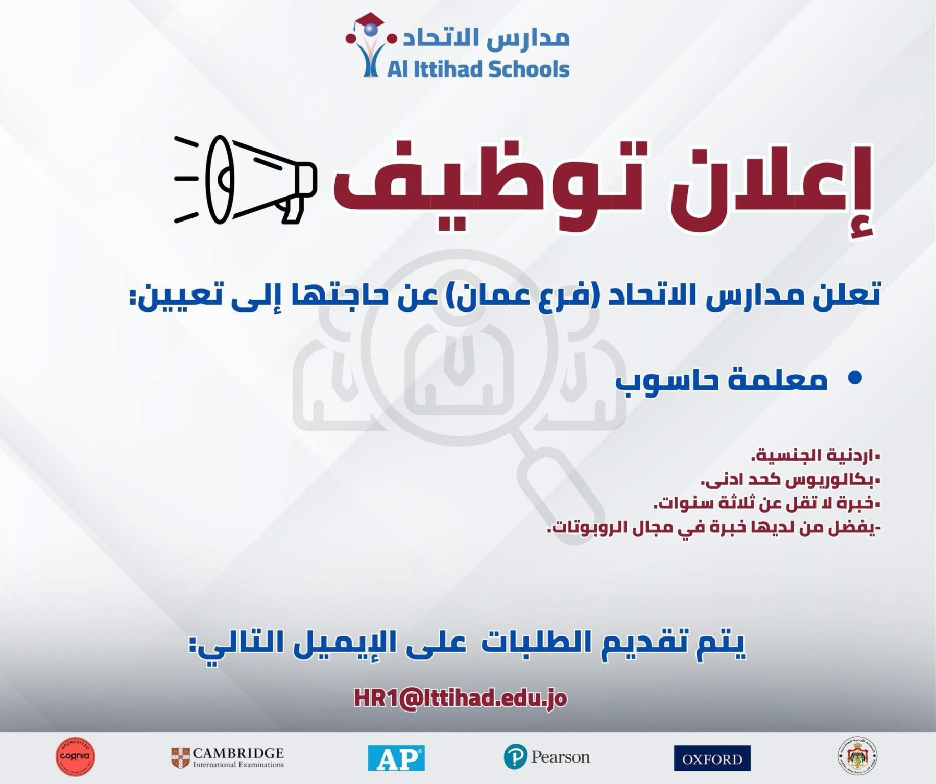تُعلن مدارس الاتحاد – فرع عمان عن حاجتها إلى معلمة حاسوب مؤهلة للانضمام إلى كادرها الأكاديمي للعام الدراسي الحالي.