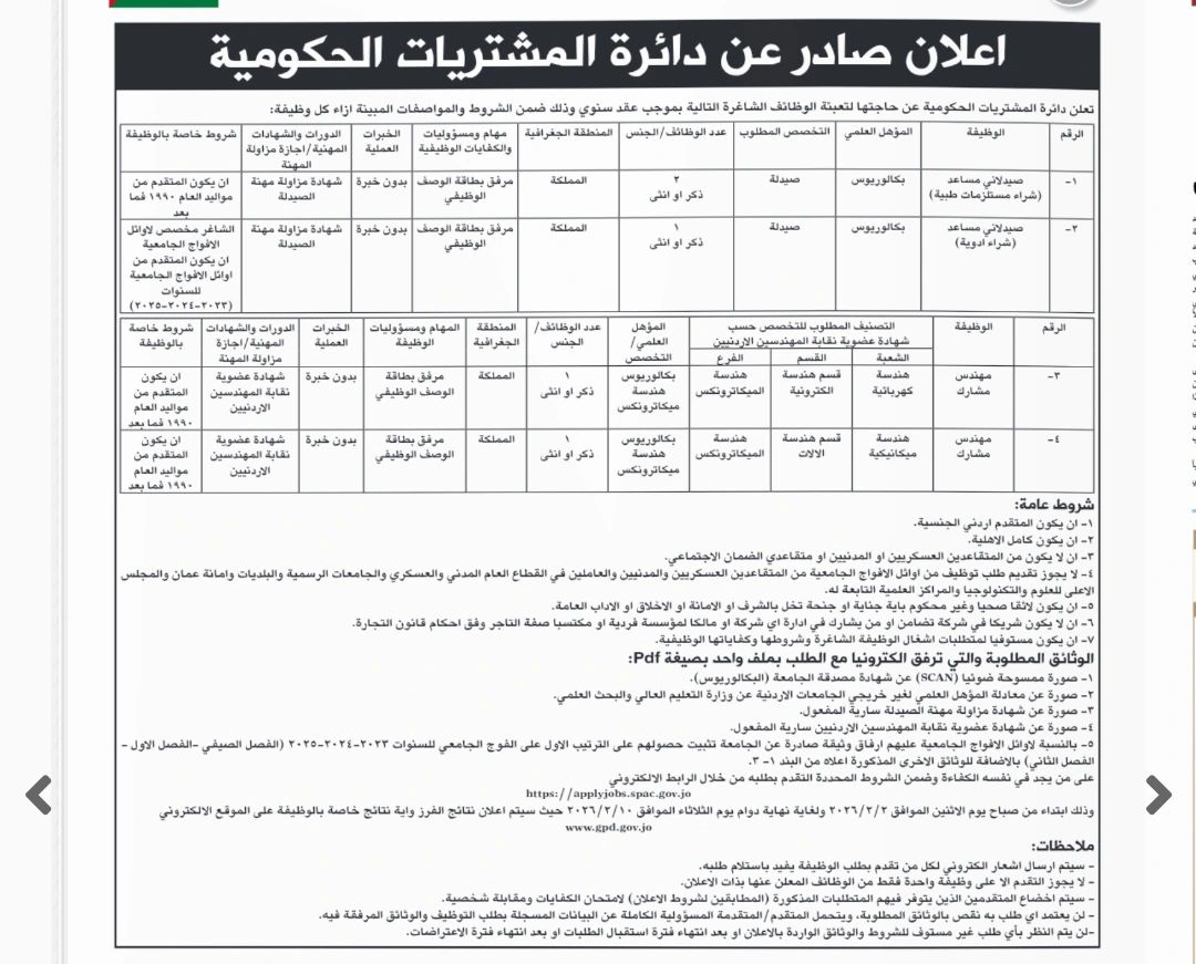أعلنت دائرة المشتريات الحكومية عن توفر شواغر جديدة بعقود سنوية في عدة تخصصات إدارية وهندسية وصيدلانية، ضمن شروط واضحة وإجراءات تقديم إلكترونية سهلة.