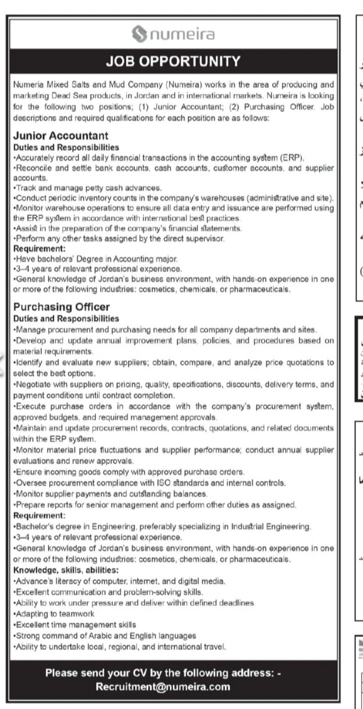 تُعلن شركة نميرة للأملاح والطين (Numeira) عن توفر شواغر وظيفية مميزة ضمن بيئة عمل احترافية وفرص نمو حقيقية، وذلك في المجالات المالية وسلاسل التوريد.