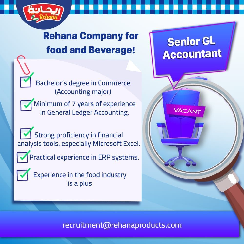 شركة Rehana للمنتجات الغذائية تعلن عن فتح باب التوظيف لوظيفة Senior GL Accountant ضمن فريق مالي احترافي وبيئة عمل مستقرة وفرص نمو حقيقية.