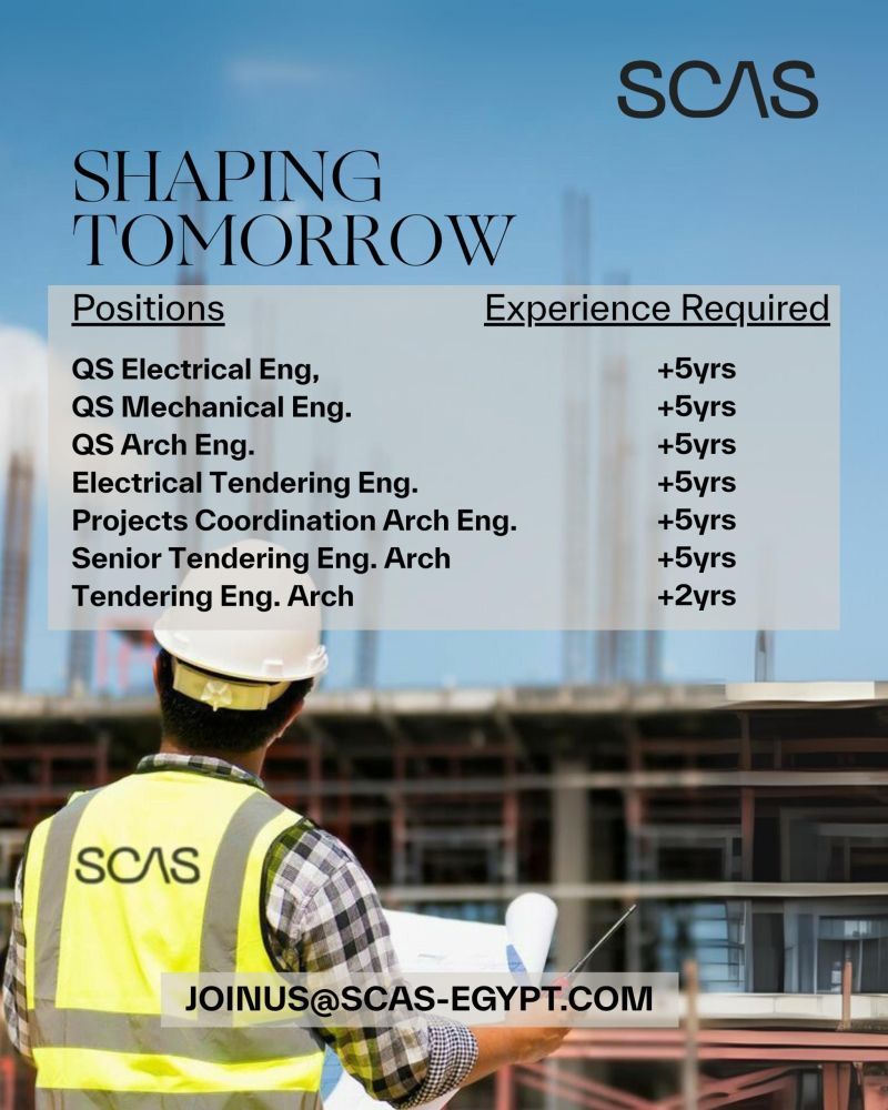 تعلن شركة SCAS Egypt عن فتح باب التوظيف لعدد من المهندسين المتخصصين في مجالات الحصر والكميات (QS) والتنديرينج وتنسيق المشاريع، للعمل ضمن مشاريع هندسية كبرى في بيئة احترافية تركز على التطوير والنمو.