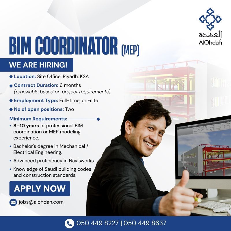 شركة AlOhdah تعلن عن حاجتها إلى BIM Coordinator (MEP) للعمل في مكتب الموقع – الرياض ضمن عقد مرن قابل للتجديد حسب متطلبات المشروع.