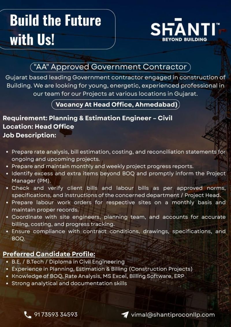 تعلن شركة SHANTI – Beyond Building عن فرصة توظيف مميزة لـ مهندس تخطيط وتقدير تكاليف (Planning & Estimation Engineer – Civil) للعمل في المقر الرئيسي بأحمد آباد ضمن مشروعات حكومية كبرى بولاية جوجارات.