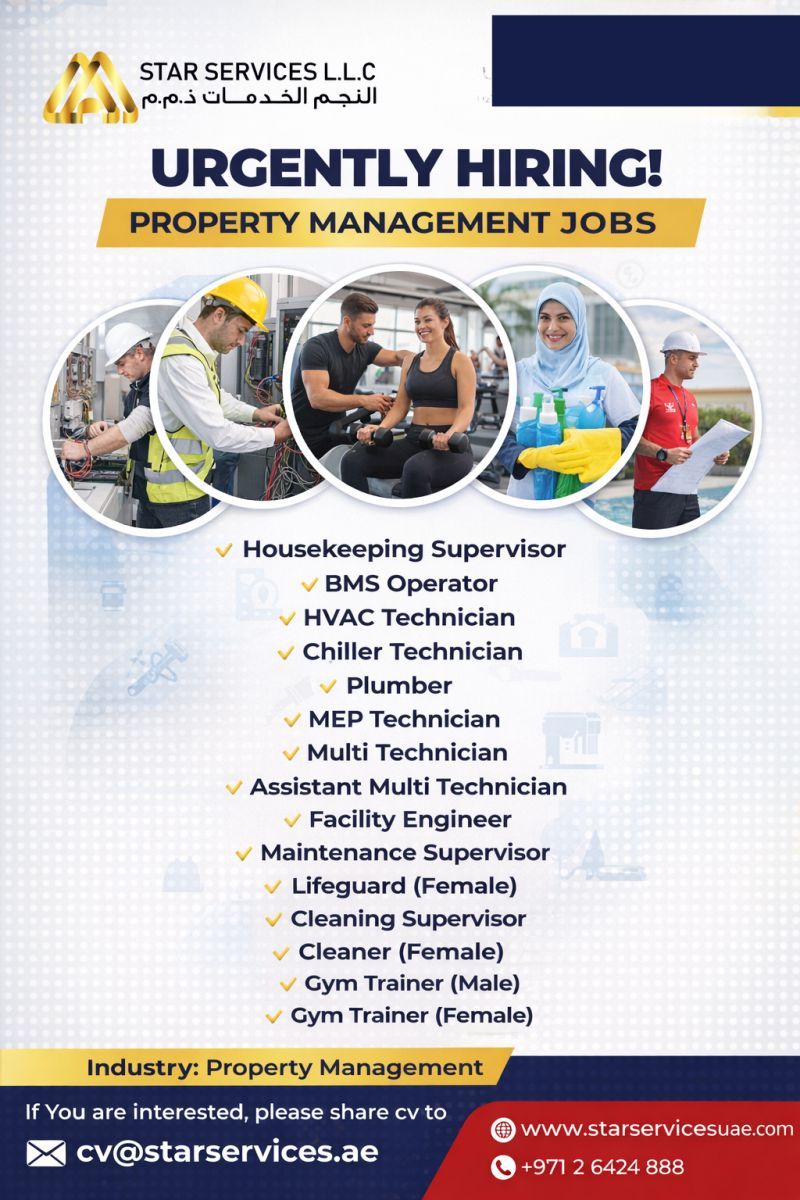 شركة Star Services L.L.C تعلن عن عدد كبير من الوظائف الشاغرة في قطاع إدارة المرافق (Property Management) للعمل الفوري داخل الإمارات.