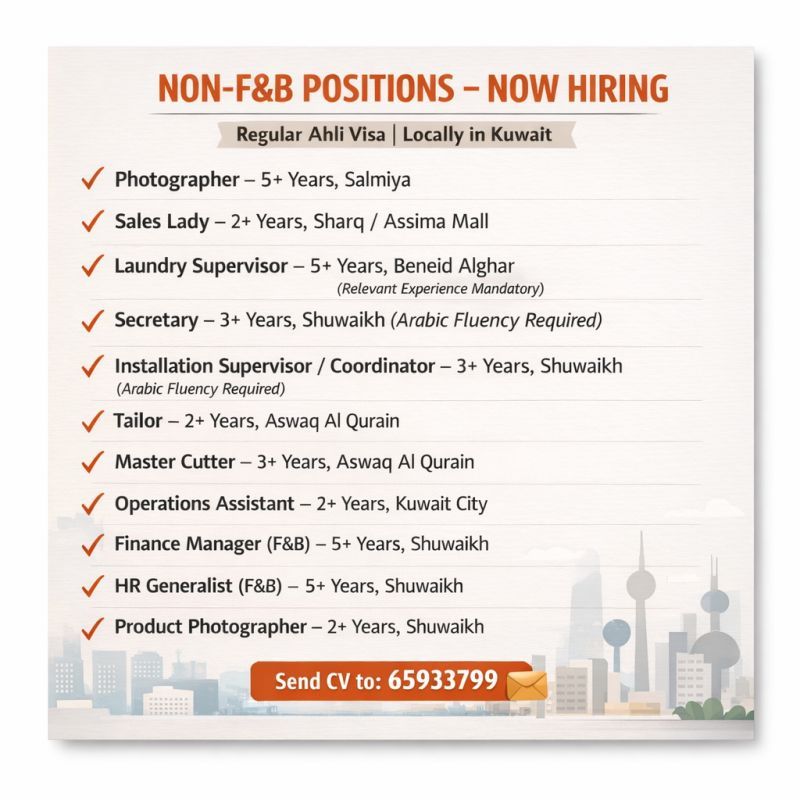 تعلن إحدى الشركات الكبرى عن توظيف عاجل لعدة وظائف شاغرة (Non-F&B Positions) داخل دولة الكويت، مع فيزا أهلي سارية وفرص عمل مستقرة برواتب تنافسية.