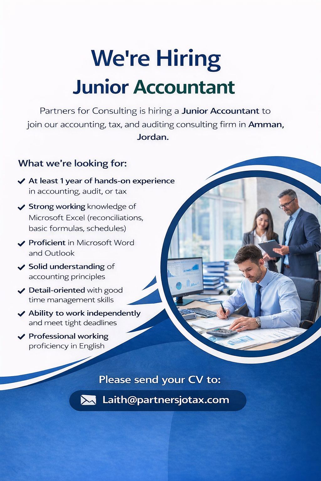 نبحث عن شخص دقيق، منظم، ويجيد العمل تحت الضغط، ولديه شغف ببناء مستقبل مهني قوي في مجال المحاسبة والاستشارات المالية.