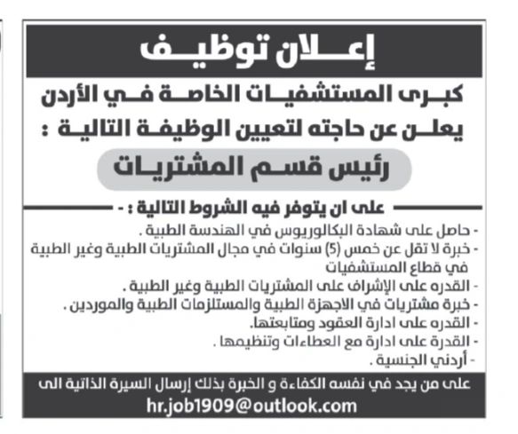 تعلن إحدى كبرى المستشفيات الخاصة في الأردن عن حاجتها لتعيين رئيس قسم المشتريات لقيادة عمليات الشراء الطبية وغير الطبية بكفاءة عالية واحترافية.