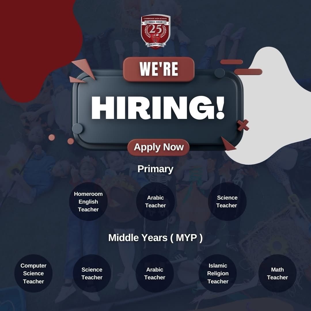 تعلن Cambridge High School عن فتح باب التوظيف للعام الأكاديمي 2026/2027، ونبحث عن معلمين ومعلمات متميزين يمتلكون الشغف، الكفاءة، والقدرة على إلهام الطلبة وصناعة الفرق داخل الصف.