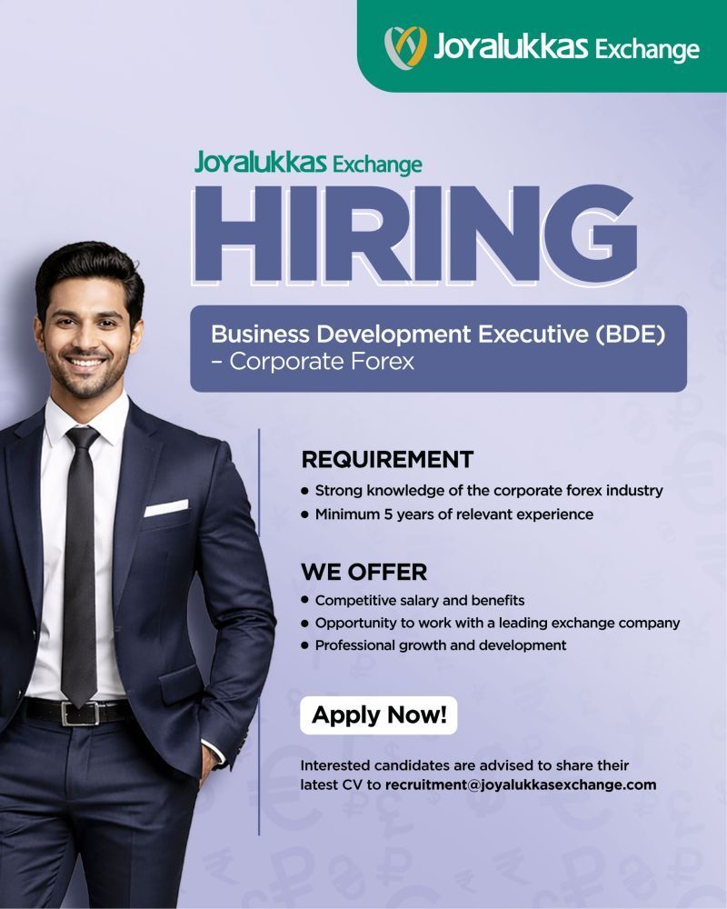 هل تمتلك خبرة قوية في مجال الفوركس للشركات؟ هل تبحث عن فرصة احترافية في شركة رائدة بسوق الصرافة والتحويلات المالية؟ الآن لديك فرصة ذهبية للانضمام إلى Joyalukkas Exchange والعمل ضمن بيئة احترافية تمنحك نموًا وظيفيًا حقيقيًا ودخلًا تنافسيًا.