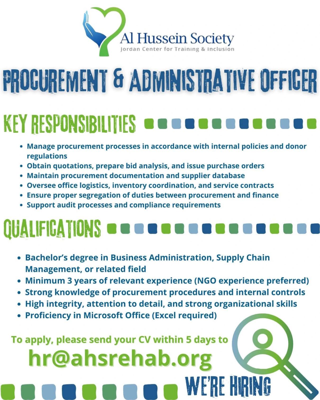 إذا كنت تمتلك خبرة قوية في المشتريات والإدارة وتبحث عن فرصة للعمل ضمن مؤسسة إنسانية رائدة في الأردن، فهذه فرصتك للانضمام إلى بيئة عمل مؤثرة واحترافية.