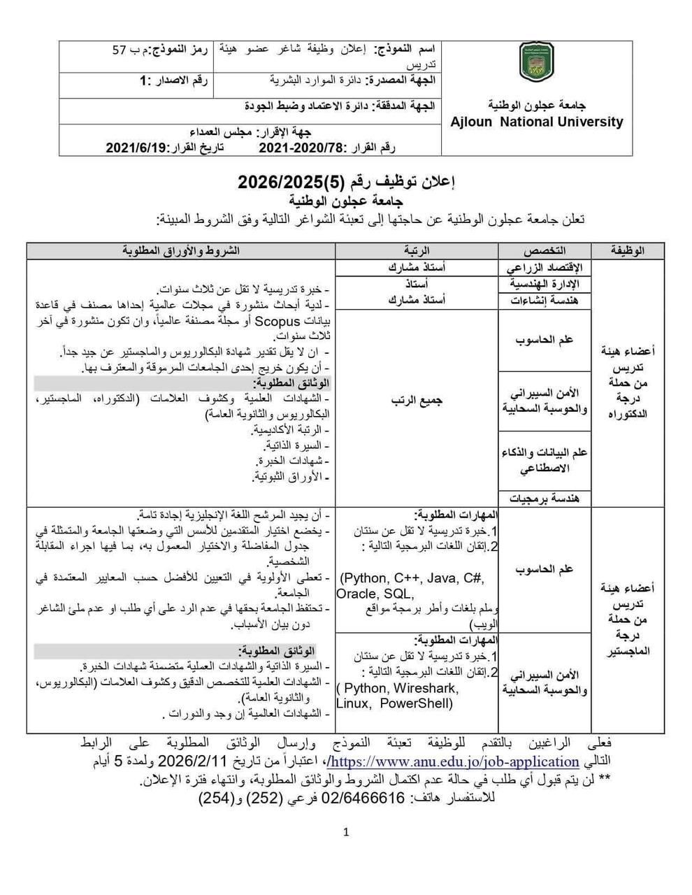 إعلان وظائف أعضاء هيئة تدريس 2026 – جامعة عجلون الوطنية