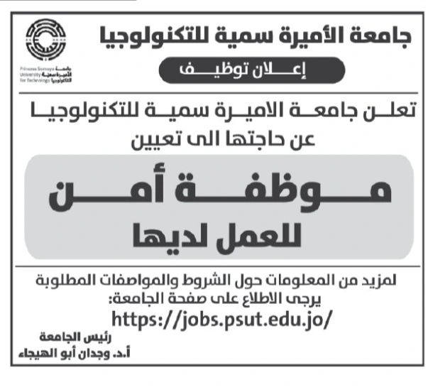 تعلن جامعة الأميرة سمية للتكنولوجيا عن حاجتها إلى تعيين موظفة أمن للعمل ضمن كادرها الإداري في الحرم الجامعي بعمّان.